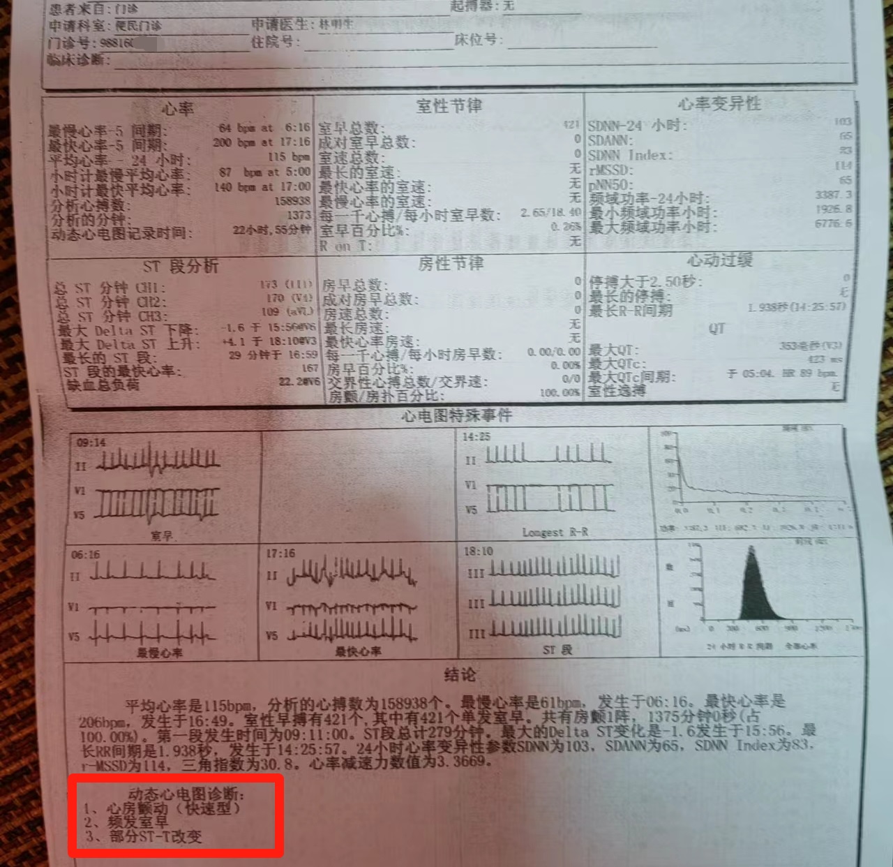 (心电图显示:心房颤动(快速型)、频发室早)